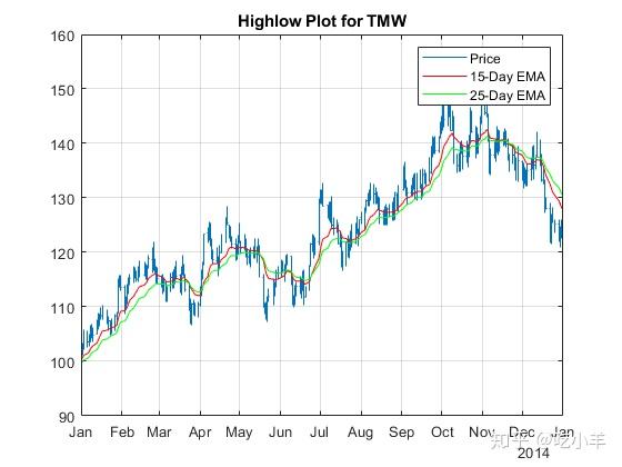 要可视化时间表数据,请使用诸如highlow或movavg的财务图表函数。对于此示例,highlow移动平均信息绘制在同一张图表上,以提供完整的可视化效果。要获取2014年的股票表现,请使用MATLAB timerange函数选择timetable的行。要可视化诸如移动平均收敛散度(MACD)之类的技术指标,请将timetable对象传递到macd函数中进行分析。