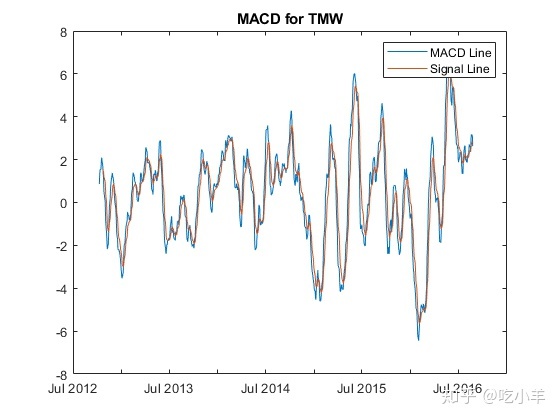 [macdLine, signalLine] = macd(TMW(:,'Close'));