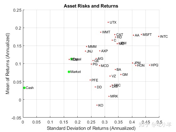 [ersk,eret] = estimatePortMoments(p,p.InitPort);专门的“帮助”函数portfolioexamples_plot(请参见工具函数部分)使得可以在此处绘制所有要开发的结果。第一张图显示了根据资产的均值和收益的标准偏差分配的资产。此外,等权重、市场和现金投资组合都绘制在同一图上。请注意,portfolioexamples_plot函数将每月总回报转换为年化总回报。