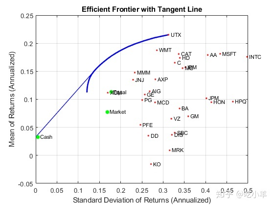 请注意,现金实际上具有较小的风险,因此切线不会穿过现金资产。