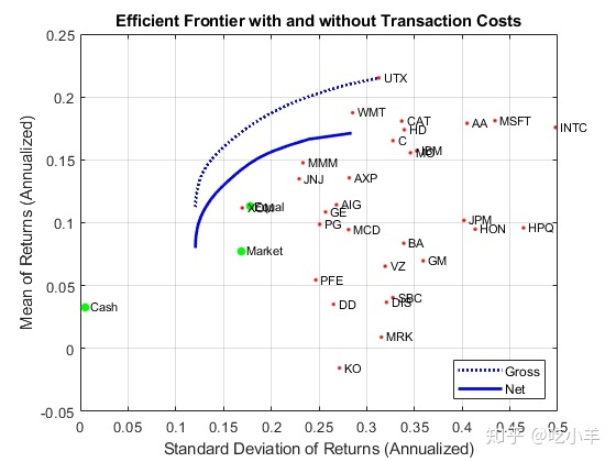 Portfolio对象使得将交易成本作为优化问题的一部分进行考虑成为可能。尽管可以为每种资产设置单独的成本,但可以使用Portfolio对象函数的标量扩展功能为所有资产设置统一的交易成本,并将有效边界与总投资收益与净投资收益进行比较。
