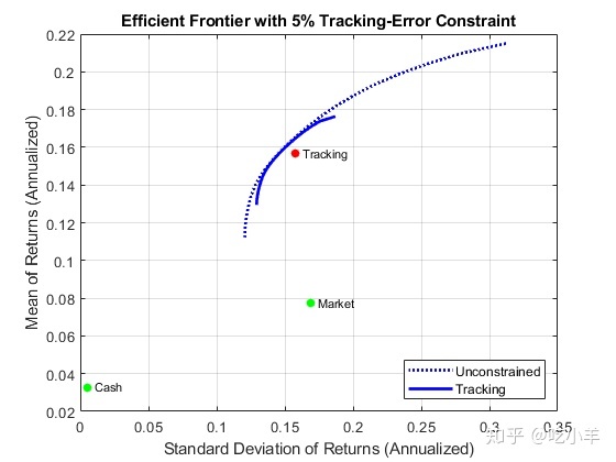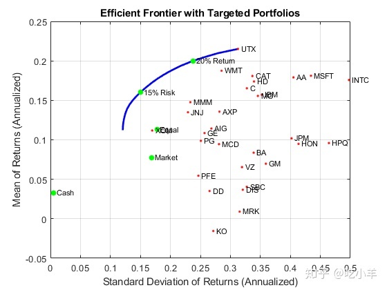 考虑到风险和回报的范围内,可以使用以下函数找到具有目标值回报和目标风险有效前沿的具体投资组合:estimateFrontierByReturn和estimateFrontierByRisk。