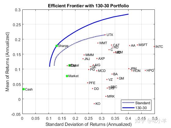 % Plot efficient frontier for a 130-30 fund structure with tangency portfolio