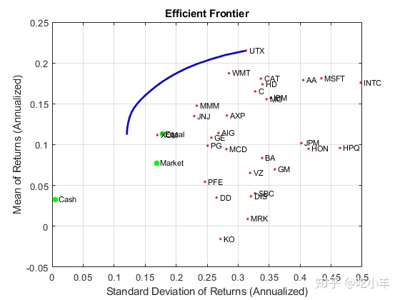 每个示例都具有用于计算30只“蓝筹”股票每月总回报的矩。尽管这些数据是从真实数据中得出的,但它们仅用于说明目的,并不代表特定资产或市场表现。该数据包含在文件BlueChipStockMoments.mat中,包括变量列表AssetList中的资产标识符变量,变量AssetMean和AssetCovar中的资产收益的均值和协方差,以及变量CashMean,CashVar,MarketMean,和MarketVar中的现金和市场回报的均值和方差。由于大多数分析都需要使用资产收益率的标准差作为风险,现金和市场方差的代表,因此将市场的方差转换为标准差。