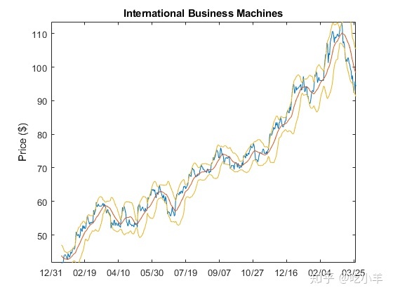 Financial Toolbox中的bolling函数使用IBM?股票价格矩阵中的所有收盘价来生成布林带图。布林带图绘制了实际数据以及其他三个数据带。上带是移动均线上方的两倍标准差;下带是该移动平均线以下的两倍标准差;中间带是移动平均线本身。本示例使用15天移动平均线。首先,使用ibm.dat数据文件加载数据,然后执行该bolling函数绘制布林带。