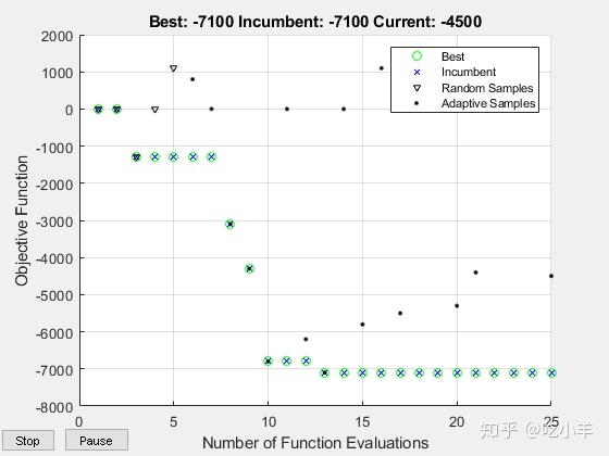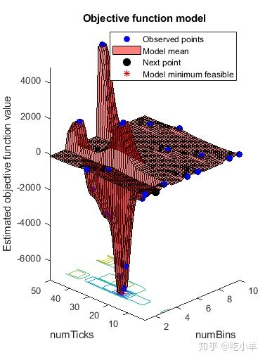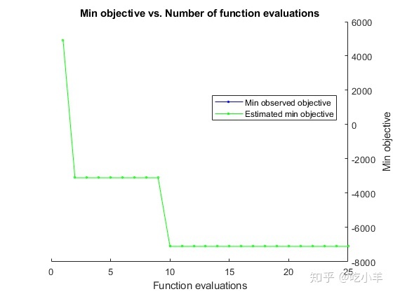 估计的最小目标与观察到的最小目标一致(搜索是单调的)。与基于导数的算法不同,bayesopt不会收敛。在尝试寻找全局最小值时,bayesopt持续搜索直到达到指定的迭代次数(25)。