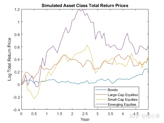 由于这是一个假设示例,因此要根据资产类别的年度资产总回报的给定均值和协方差来模拟资产价格,portsim函数可用于创建具有所需均值和协方差的资产收益。具体来说,portsim用于模拟五年的每月总收益,然后绘制以显示模拟的总收益价格的对数。