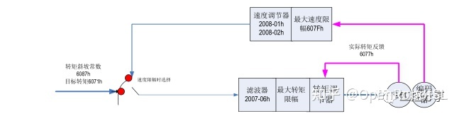 此模式下,上位控制器将目标转矩 6071h、转矩斜坡常数 6087h 发送给伺服驱动器,转矩调节由伺服内部执行。当速度达到限幅值将进入调速阶段。